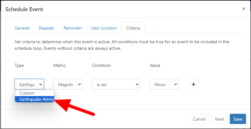 The CMS comes with two criteria types; Weather and Custom. When interfacing with another system it may be desirable to give users a pre-defined list of criteria metrics and values to choose from whilst scheduling. This can be achieved using a Connector.