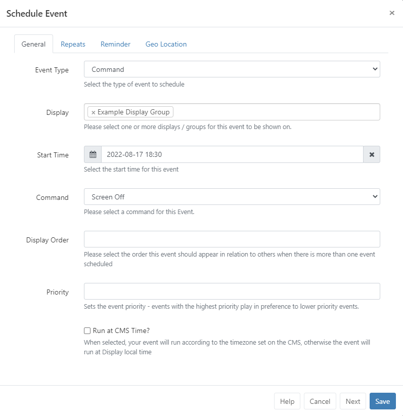 As in the example image above, the selected Start Time would cause the screen to turn off at 18:30 for the selected Display Group. You could then use a Repeat to cause that to happen every day for example.