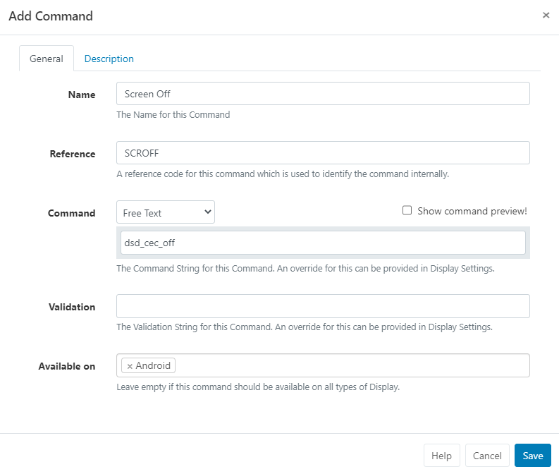 Create 2 commands to use: Screen On: dsd_cec_on and Screen Off: dsd_cec_off