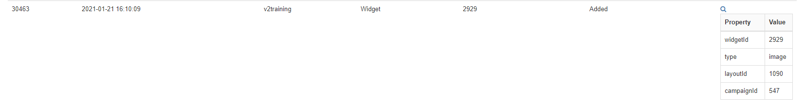 Looking at the above example you can see that an Image Widget was added to a Layout on the 21st of January at 16:10 hrs by user ‘v2training’