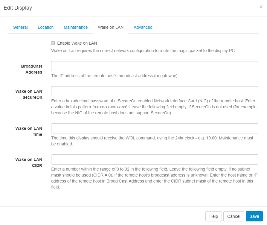 Assuming the hardware and network supports Wake on LAN, it is configured in the CMS using the Display Edit Form.