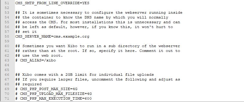 To modify the file upload size limit, navigate to the directory where you have installed your Docker CMS and edit your config.env file. You will see that the last entries relate to the file upload limits: