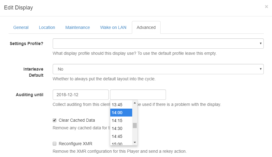 - Once Debugging mode is on , navigate to the Displays page under the Displays section of the menu on the CMS and use the row menu for the selected Display, click Edit.