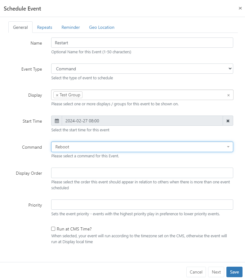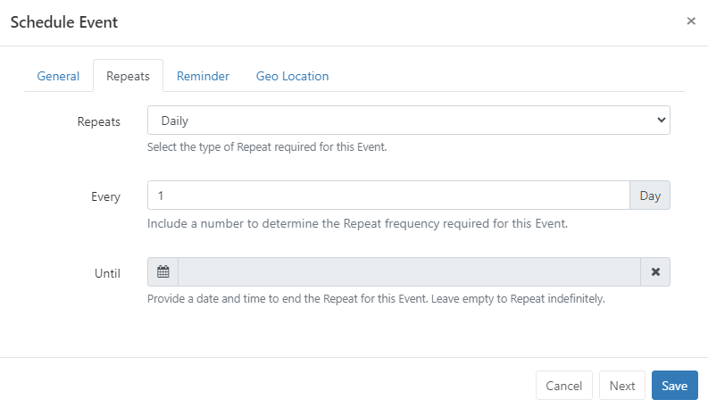 - Using the Repeats tab, you can set the Event to repeat as required: