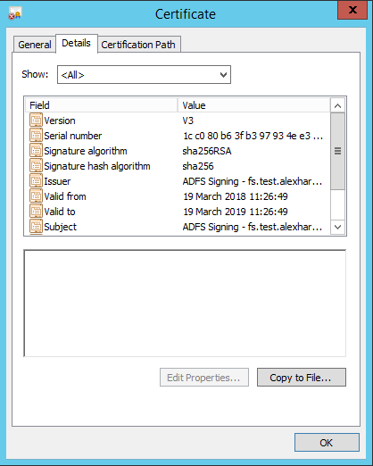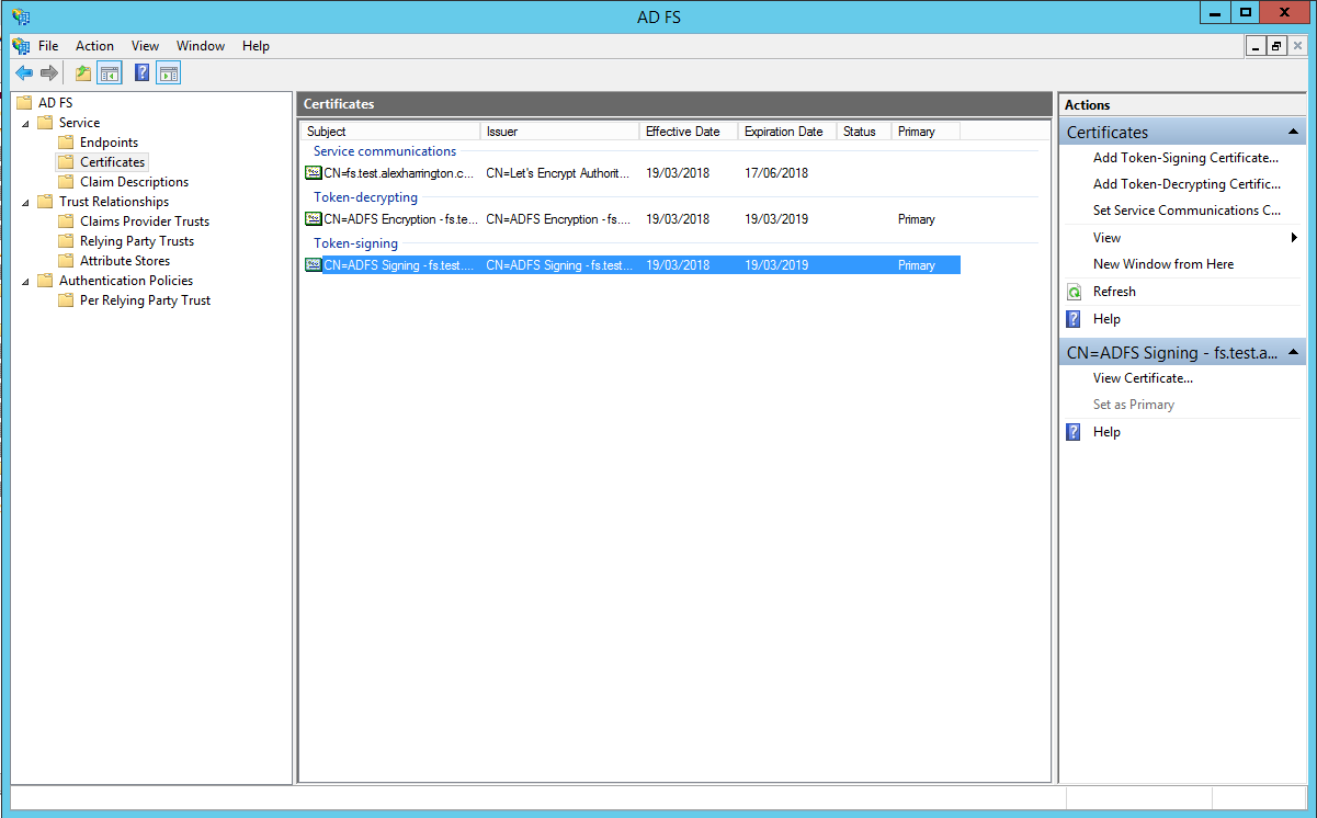https://fs.test.alexharrington.co.uk/adfs/ls/ should bring up a webpage served by ADFS with an error. That’s normal. We’re just checking connectivity here.