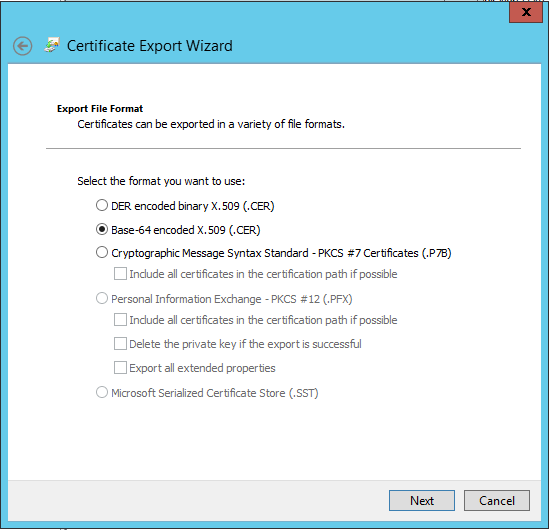 Base-64 encoded X.509format, and save the file somewhere convenient: