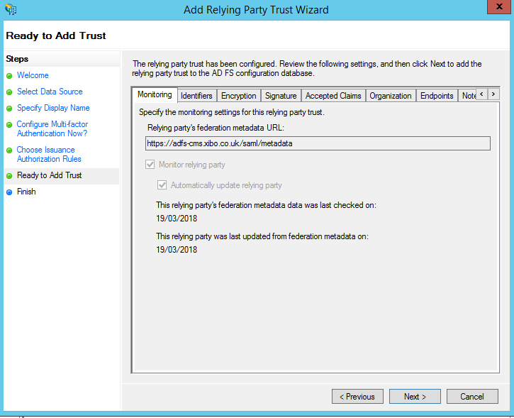 There are various advanced options presented, most of which are out of the scope of this guide. Please select the options you require. In my case, I choose I do not want to configure multi-factor authentication settings for this relaying party trust at this time and Permit all users to access this relaying party when prompted.