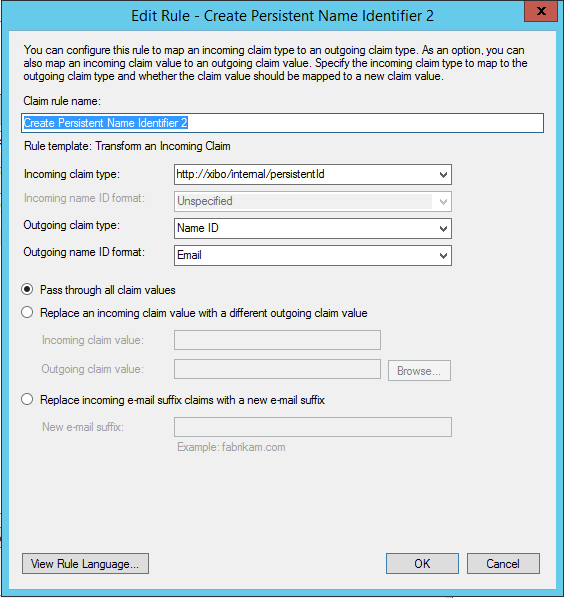 Transform an Incoming Claim. Call this ruleCreate Persistent Identifier 2, and configure as follows: