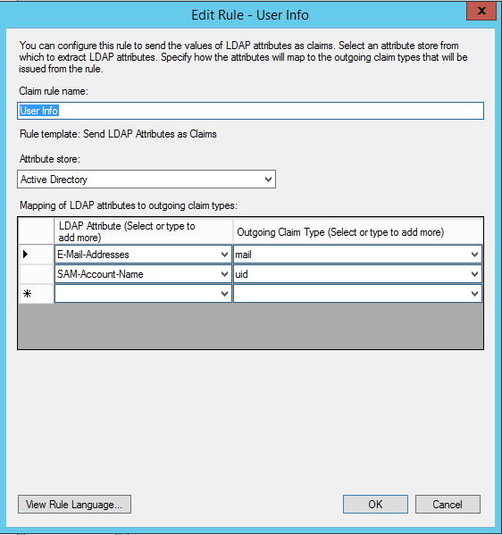Send LDAP Attributes as Claims. Name itUser Info, and set it up as follows: