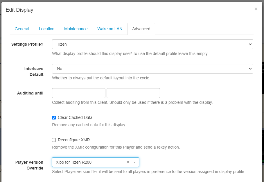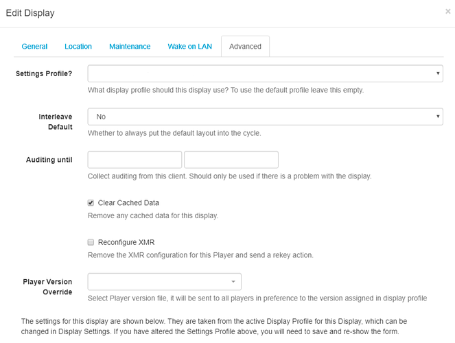 - Click on the Advanced tab and use the Player Version Override drop-down to select the version to assign to the Display.