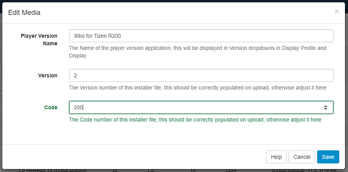 wgtfile for the Xibo for Tizenb Player you wish to revert to. - Once uploaded, use the row menu for the Player version and select Edit from the drop down menu.