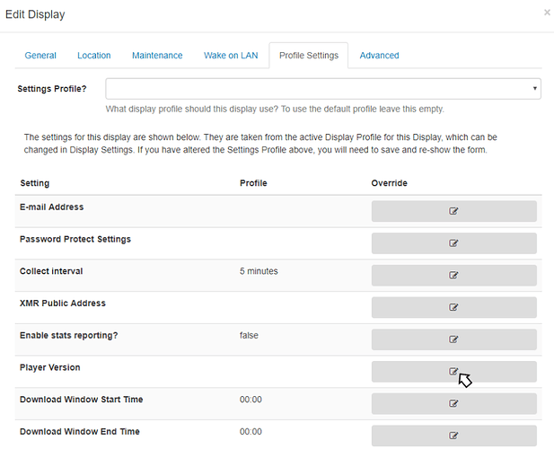It may be necessary to run a different Player Version on selected Displays, this can be achieved by using the Player Version Override .
