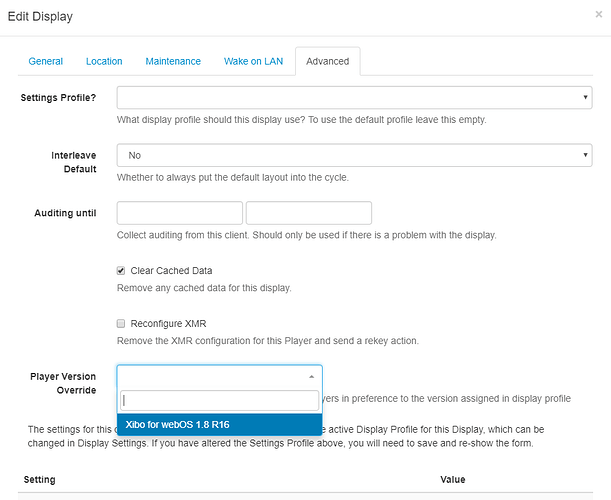 It may be necessary to run a different Player Version on selected Displays, this can be achieved by using the Player Version Override option.