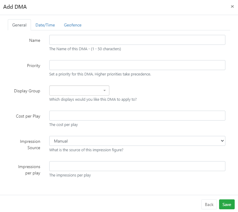 - Next set a Cost per Play/Impressions per Play to apply to this DMA to differ from the Cost per Play/Impressions per Play set on the Display itself.