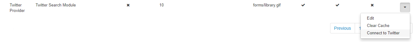 • Click on Modules under the Administration section of the CMS main menu, locate the Twitter Search Module and use the row menu:
