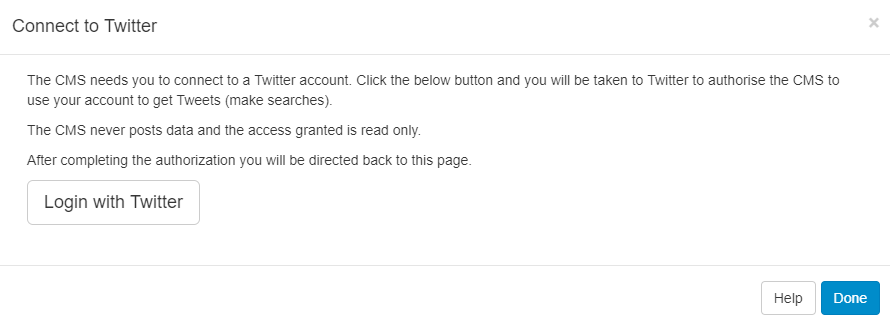 • Select Connect to Twitter to show a form with a Login with Twitter button which will allow you to authorise the CMS to connect via your Twitter account.