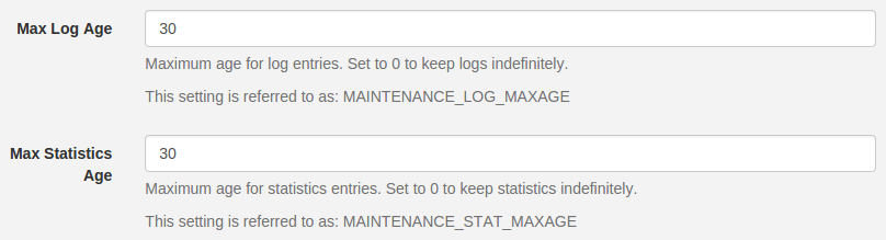 • Max Log Age (MAINTENANCE_LOG_MAXAGE) controls how many days logs should be retained in the CMS database before being automatically deleted. A setting of 5 would keep logs for 5 days which is reasonable for most debugging purposes.
