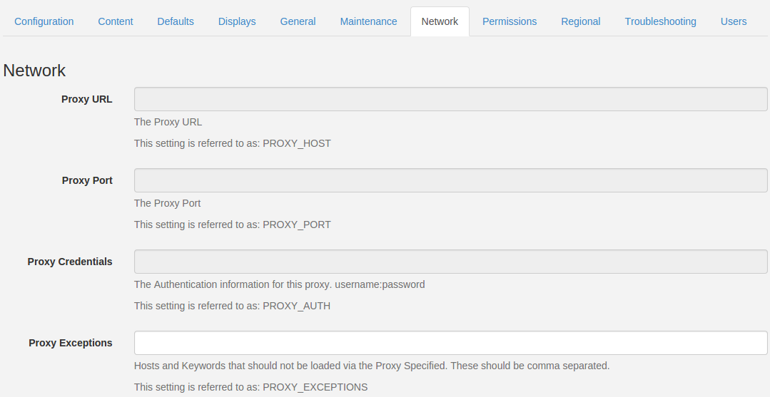 • Proxy Exceptions (PROXY_EXCEPTIONS) are any host or keyword that should be excluded from being sent to the proxy server. For example, if you have an intranet server then you could exclude it by entering intranet.domain.com. Multiple entries can be included by separating them with commas. Leave this blank if you don’t require any proxy exceptions.