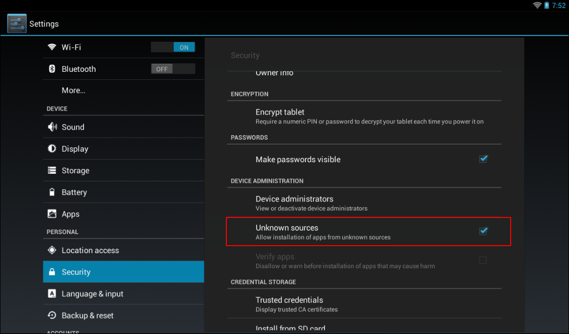 Xibo for Android is a non-market Android application, which means the device will need to be configured to allow the installation of applications from unknown sources. This setting is found in the “Security” or “Applications” section of the standard Android “Settings tab”.