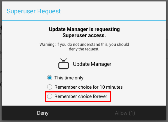 After selecting Allow a message will appear saying that Superuser access has been granted and the configuration for auto-update on the Player is complete.