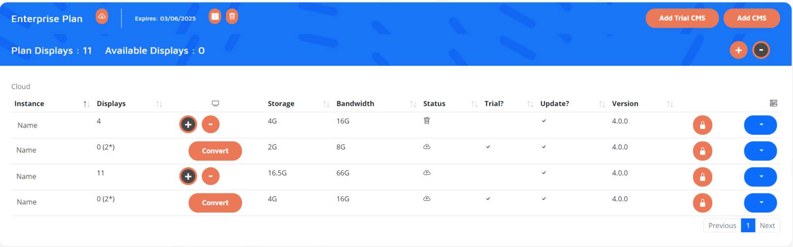 We limit the number of Displays that can be authorised on the CMS, the size of the CMS library, and the total amount of bandwidth that can be consumed based upon what you have purchased. You can change these limits by purchasing more bandwidth/storage from My Account at anytime.