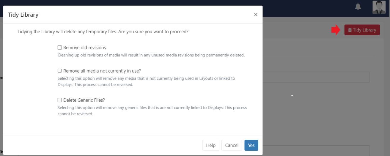 The Library can be tidied by a Super Administrator or User so that it is kept clean and small. Actions cannot be reversed so this must be used with caution.