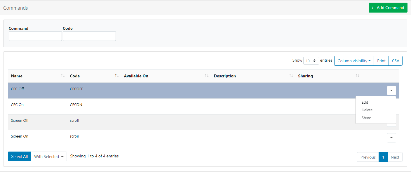 Use the row menu for a Command to Edit, Delete and set Share options.