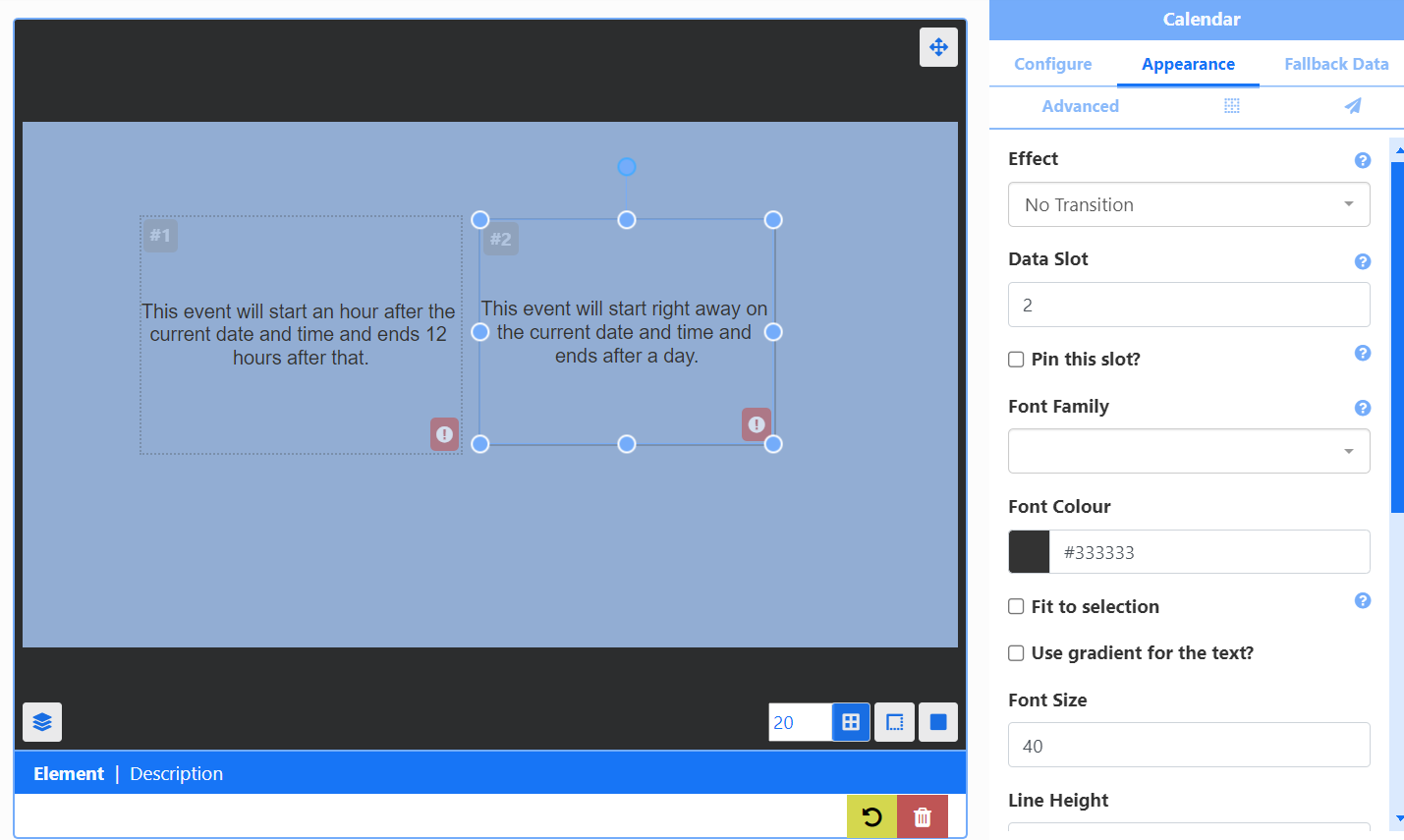 The Appearance tab includes options to configure how the data returned from the Element should look and includes transition effects and Data Slot configuration.