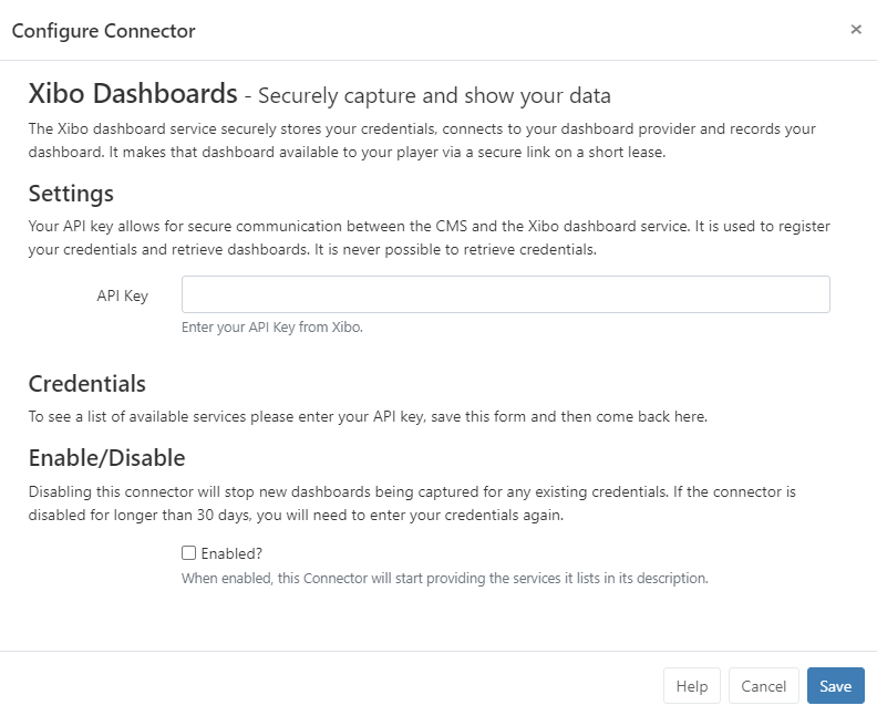 - Click the Configure button for the Xibo Dashboard Service connector: