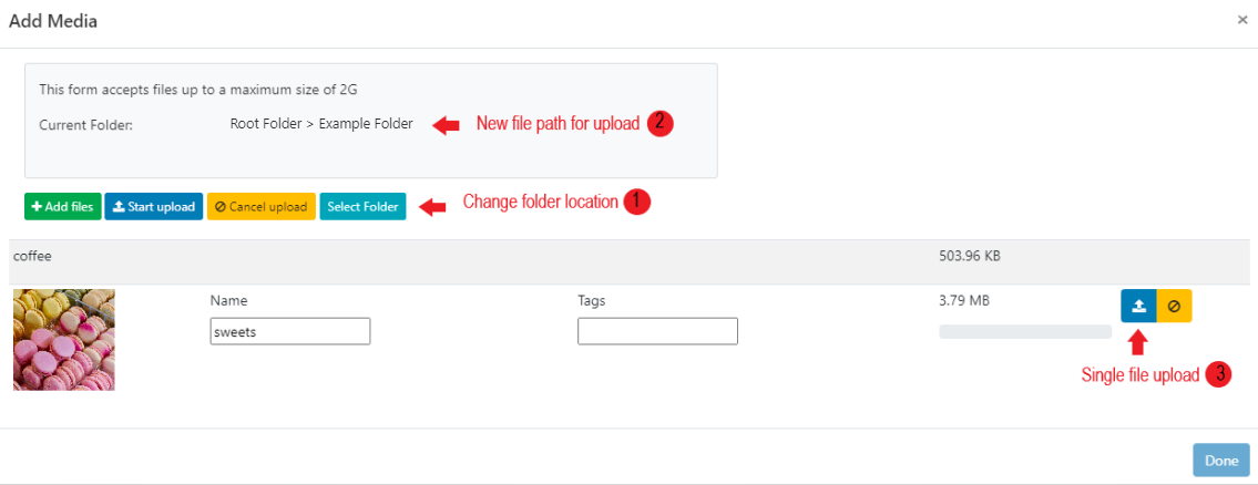 Files can also be uploaded individually and have different Folder locations specified: