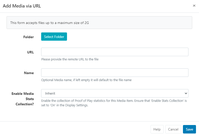 • Set the collection of Proof of Play statistics to On / Off / Inherit for the selected media file.