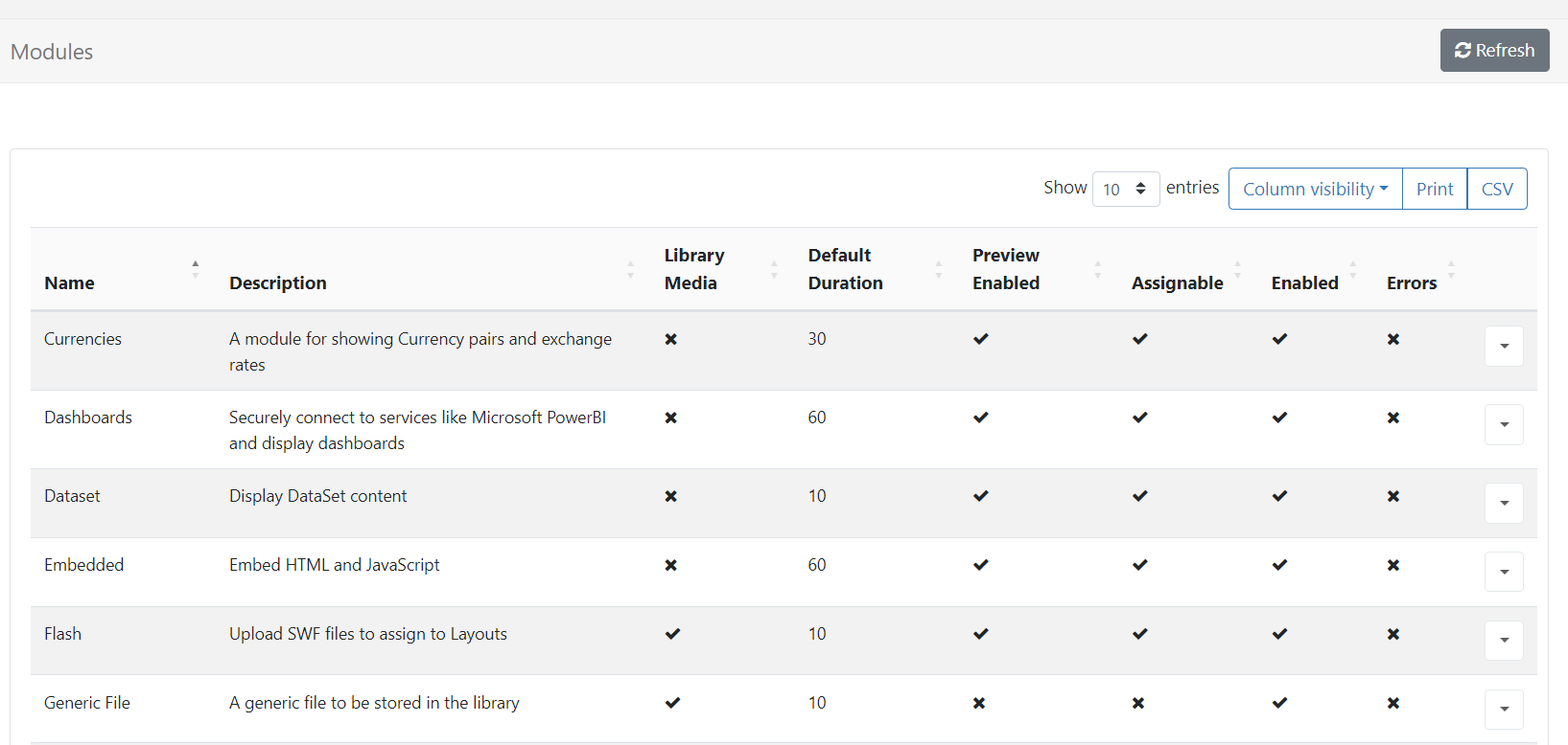All content displayed in Xibo is served by a Media Module managed from the Modules page under the Administration section of the main CMS menu:
